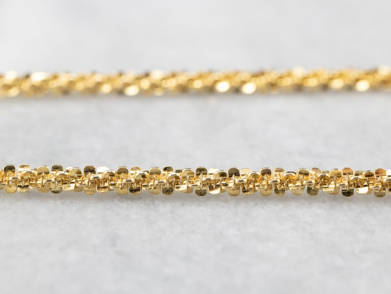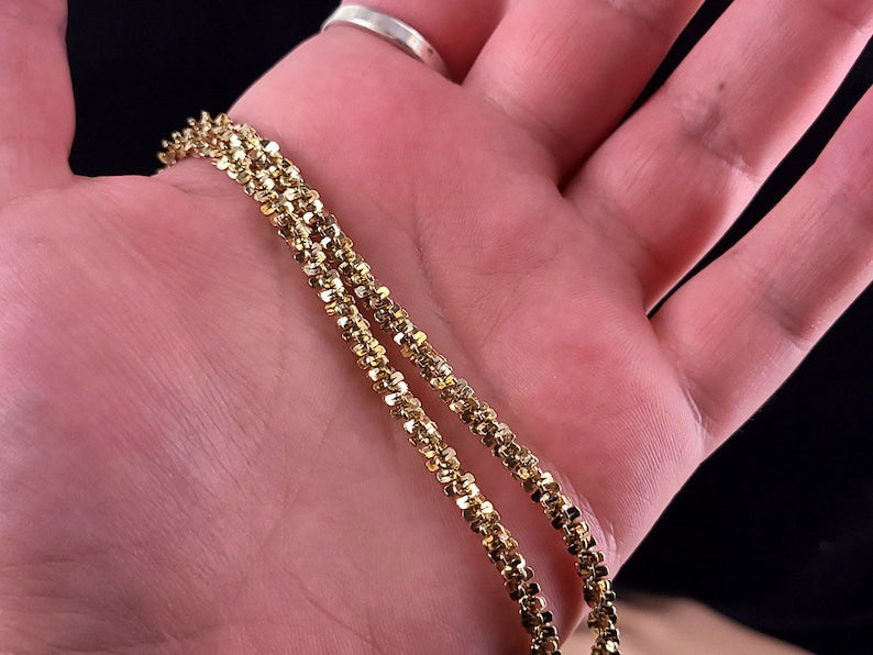أضف لمسة من الأناقة الخالدة إلى مجموعة مجوهراتك مع هذه السلسلة الذهبية الأنيقة المطلية بالذهب . صُنعت هذه القطعة بدقة، خفيفة الوزن ومتينة، بتصميمها متعدد الأوجه المتألق الذي يعكس الضوء بشكل جميل، مما يجعلها مثالية للارتداء اليومي والمناسبات الخاصة.