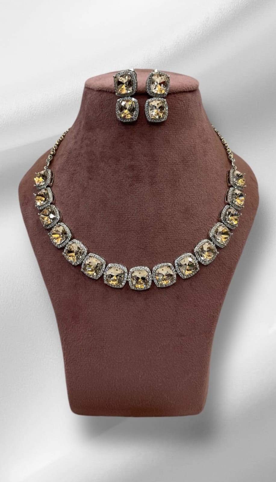 Brighten up any look with the “Golden Glow set” jewelry set, featuring a dazzling array of radiant yellow gemstones framed in a delicate silver halo. This set includes a beautifully crafted necklace with matching earrings, each stone shining with a warm, sunlit brilliance. Perfect for both daytime elegance and evening sophistication, this set adds a touch of opulence to any outfit. Whether for a special occasion or to elevate your everyday style, “Golden Glow” is designed for those who love to make a bold, glamorous statement.