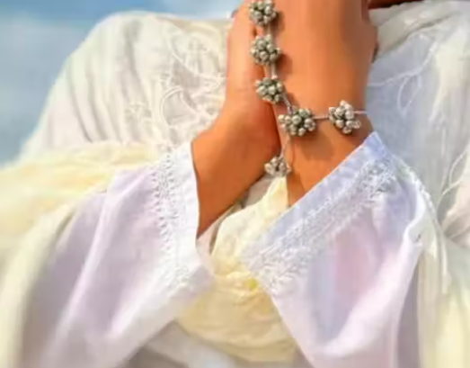 Bring traditional charm to your look with this oxidised silver ghungroo hand harness. Adorned with multiple tiny ghungroo clusters, this elegant piece connects from ring to bracelet with delicate chains, creating a graceful jingling effect with every move. Perfect for festive wear, weddings, and cultural occasions, it blends heritage with style while staying comfortable for long wear.