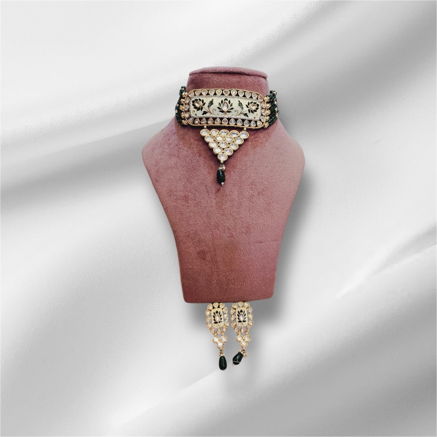 The Emerald Elegance Choker is a striking piece that combines traditional artistry with modern charm. This choker features a rectangular central panel adorned with delicate floral engravings in gold, set against an off-white base. Surrounding the central motif is a row of sparkling stones, adding a layer of brilliance. Below the centerpiece hangs a triangular pendant encrusted with clear, sparkling stones and finished with an emerald green teardrop bead.