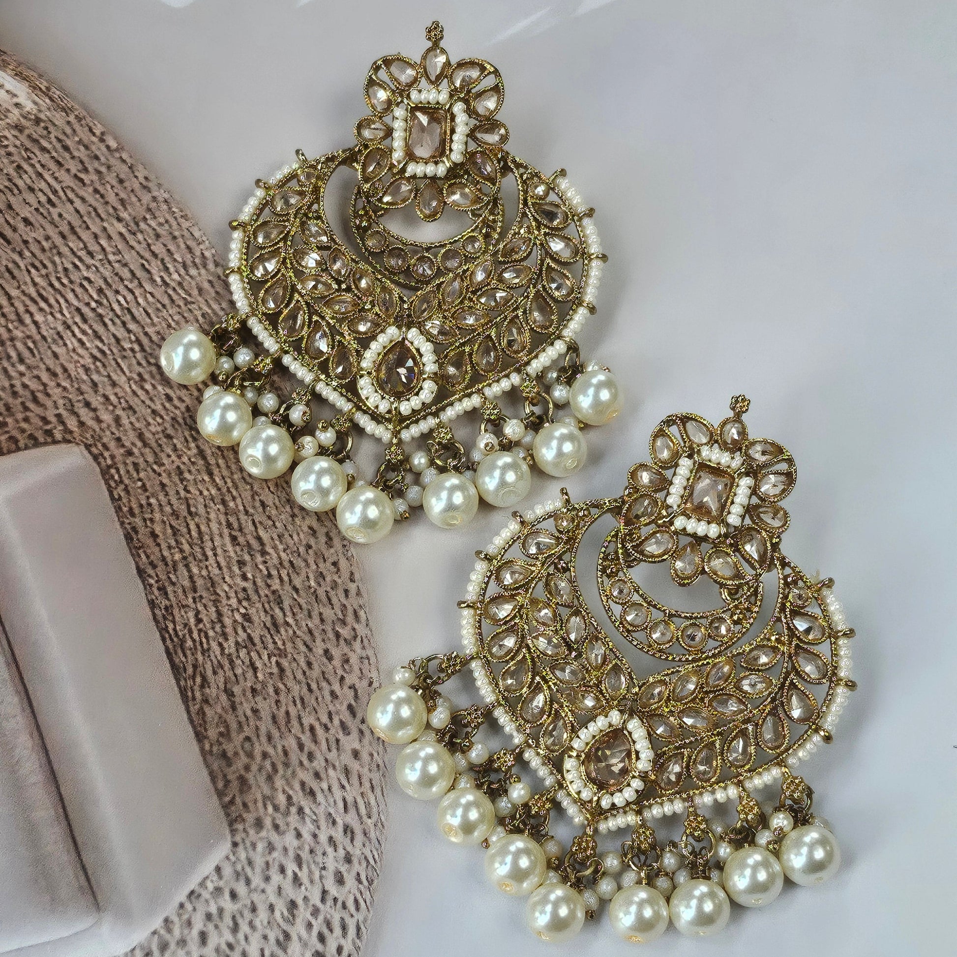 Turn heads with the Regal Radiance Chandbalis, a breathtaking blend of intricate craftsmanship and traditional charm. Adorned with luminous pearls, shimmering stones, and elegant gold detailing, these earrings are designed to exude royal sophistication.