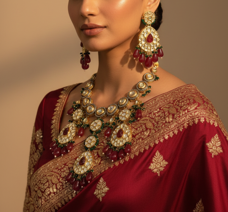 Complementing the choker is a stunning necklace and matching earrings, each intricately designed with gold-toned floral patterns and vivid ruby accents. The set completing your royal look for weddings, festive celebrations, or cultural events. This set is a perfect blend of heritage-inspired design and contemporary charm, ensuring you stand out with grace and elegance.