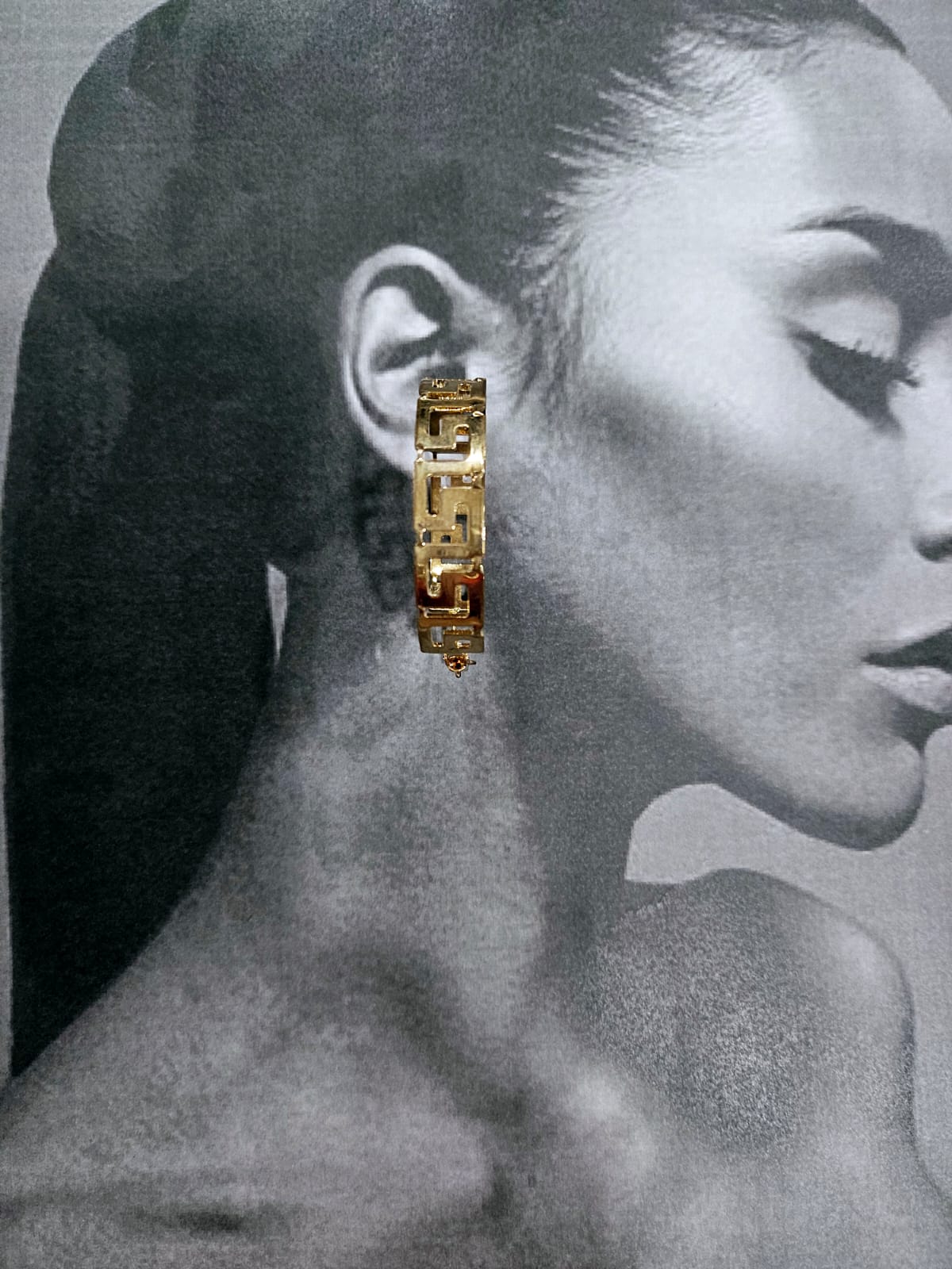 Unleash timeless elegance with the Eterna Hoops, a stunning fusion of modern design and classic charm. Featuring sleek gold-tone detailing and intricate geometric patterns, these lightweight hoops are crafted to perfection for both durability and style. Their versatile size makes them an effortless accessory, whether for an evening out or elevating your everyday look.