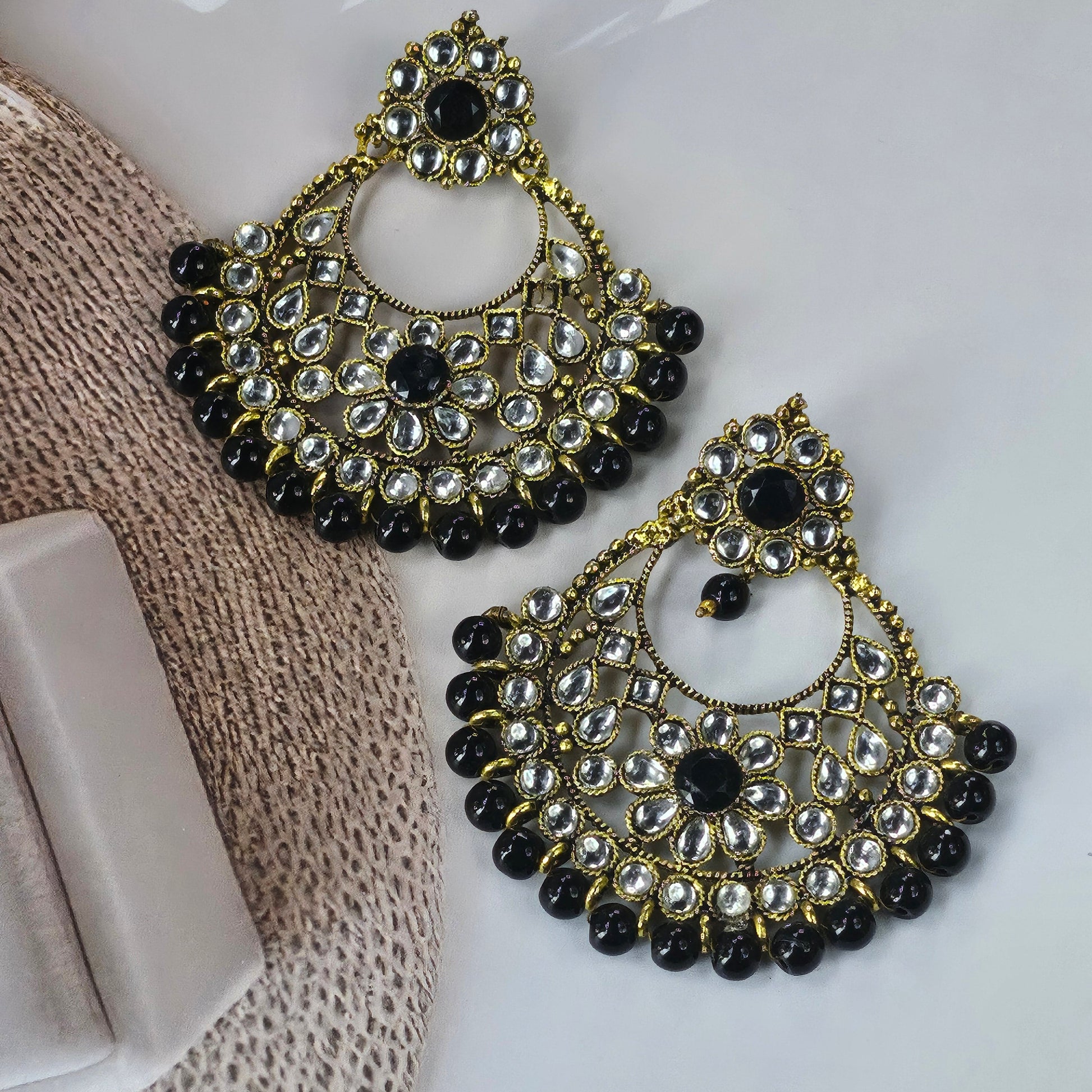 Designed hand crafted with love by our artisans in India these beautiful Kundan Chand Bali Earrings jewelry in golden Mehndi finish with Polki Kundan with black beads stones to make these exquisite Earring really special – light in weight & can be paired with almost any outfit perfect accessory for every occasions party & wedding.