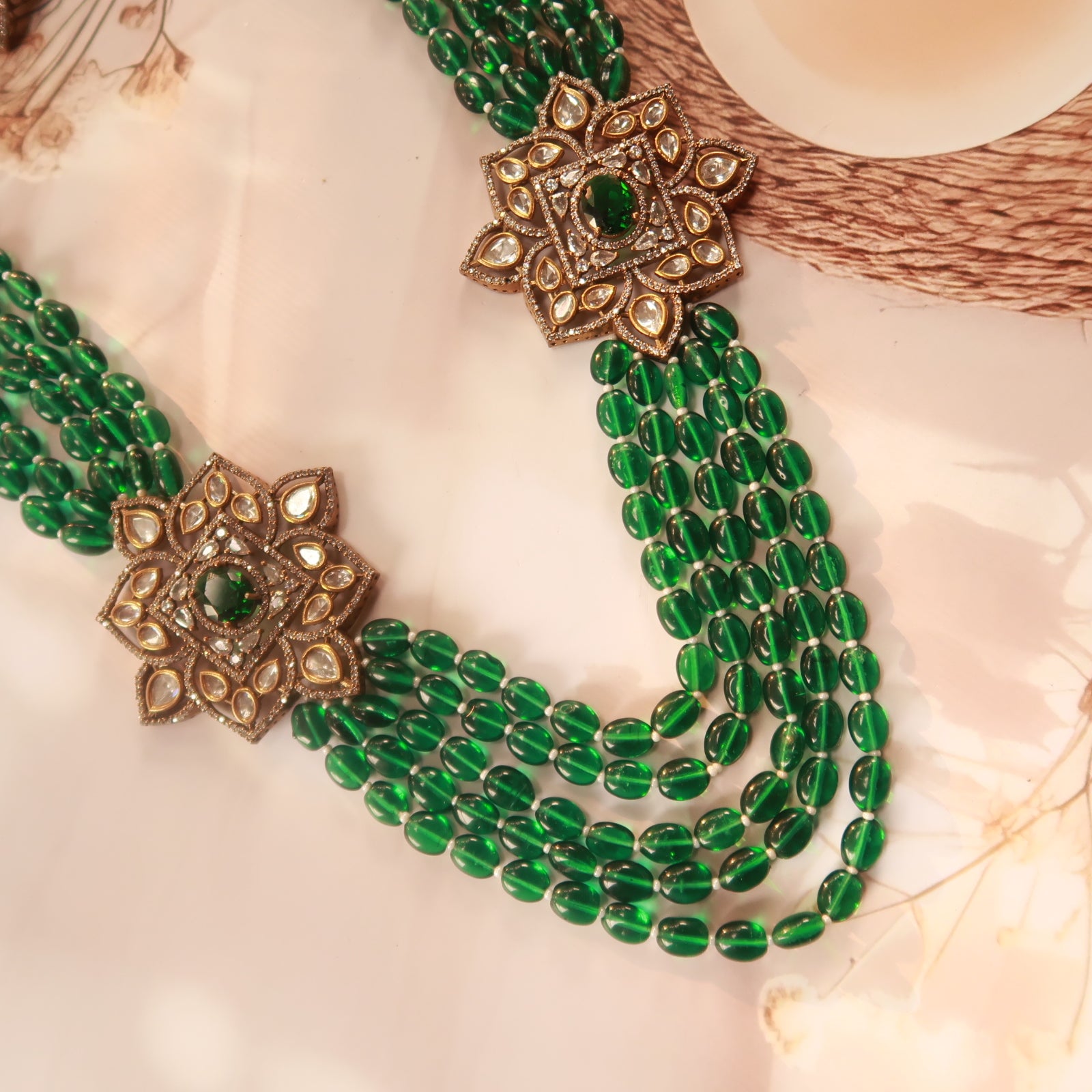 Unveil the allure of regal elegance with the Emerald Bloom Kundan Set, a breathtaking fusion of heritage and sophistication. This luxurious set features multiple strands of rich green beads, gracefully draped to create a royal layered effect. The true showstoppers are the majestic floral-shaped kundan motifs, adorned with polished emerald-green stones and sparkling uncut kundan diamonds, adding a touch of vintage grandeur.