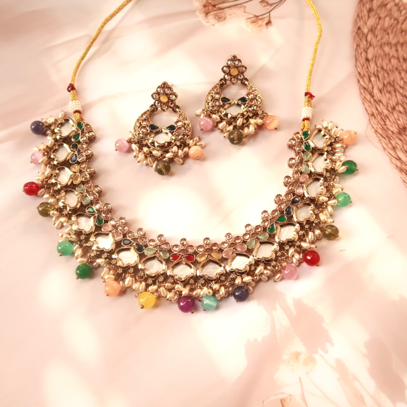 Elevate your elegance with the Royal Multicolor Mother of Pearl set , a mesmerizing blend of traditional artistry and modern grace. This exquisite choker features intricately handcrafted kundan work, forming a stunning floral and heart-shaped motif. The shimmering white kundan stones are complemented by delicate pearl embellishments and vibrant multicolored gemstone danglers, adding a touch of regal charm to the piece.