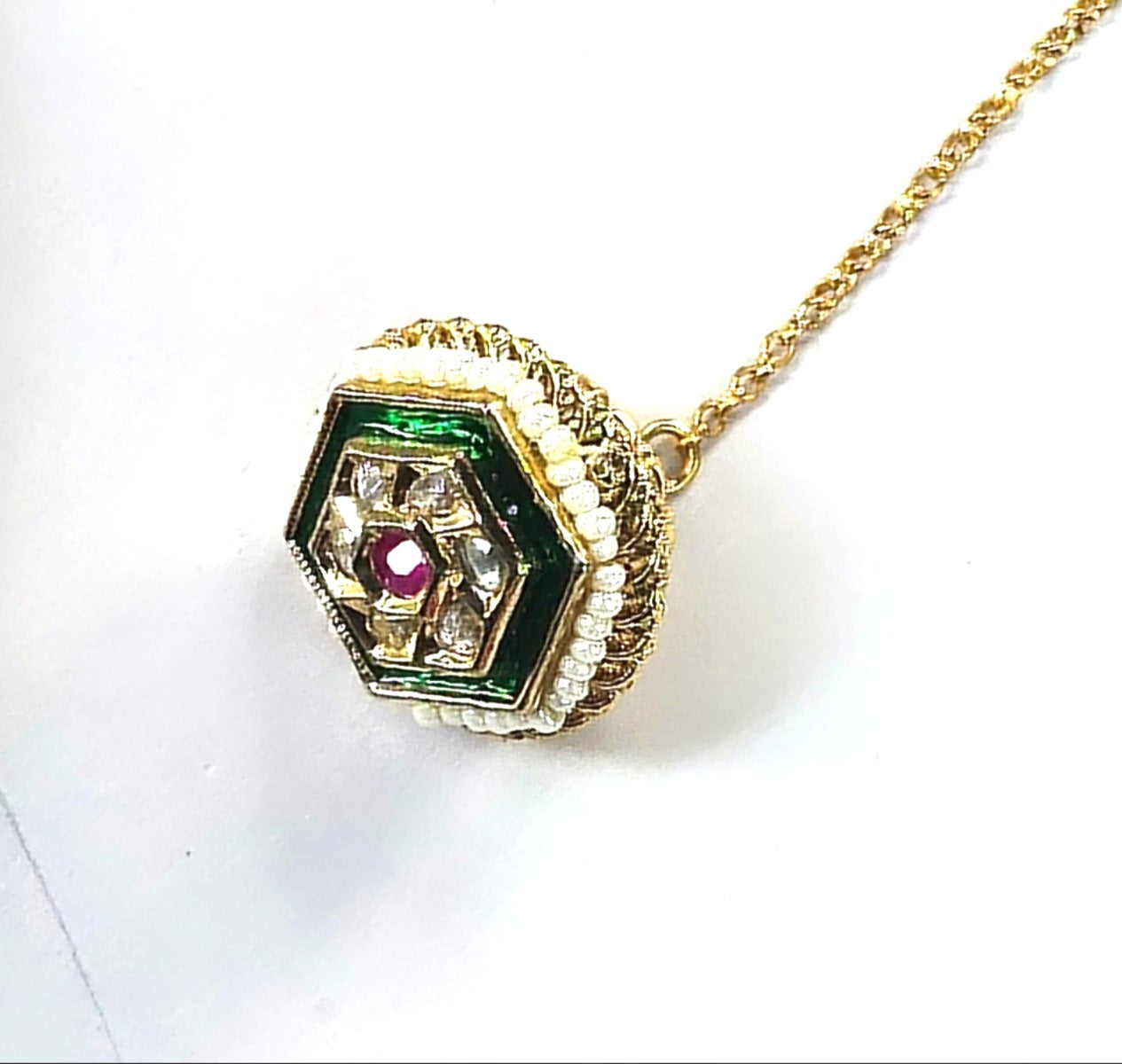 Add a unique traditional touch to your ethnic look with this beautifully crafted hexagon-shaped kundan maang tikka. Designed with a striking green enamel border, it features sparkling kundan stones arranged around a rich ruby-toned center. Delicate pearl detailing and a gold-finish chain complete the design, giving it a refined and regal appeal.