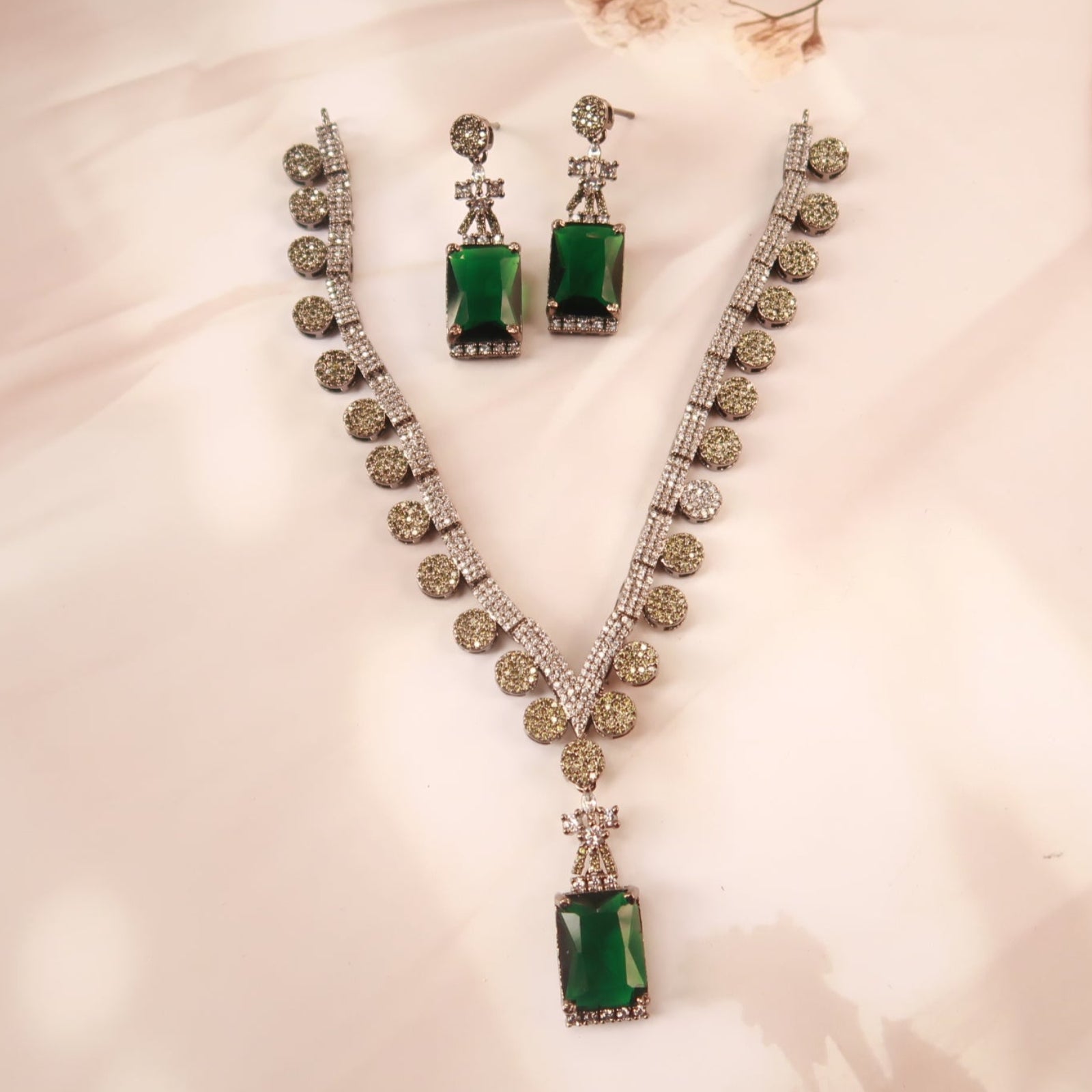 Elevate your evening ensemble with a set that captures the essence of royal heritage reimagined for the modern era. The centerpiece of this collection is a breathtaking emerald-cut pendant, suspended from a meticulously crafted "V" shaped collar.