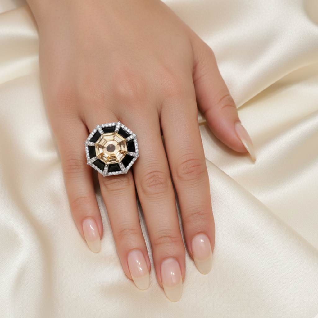 Command attention with the Midnight Luxe Ring, a striking blend of modern sophistication and timeless glamour. Featuring a captivating octagon-cut champagne gemstone at its core, this bold statement piece is framed by a dramatic black enamel design, accentuated with shimmering crystal paves for a high-contrast, luxurious finish.